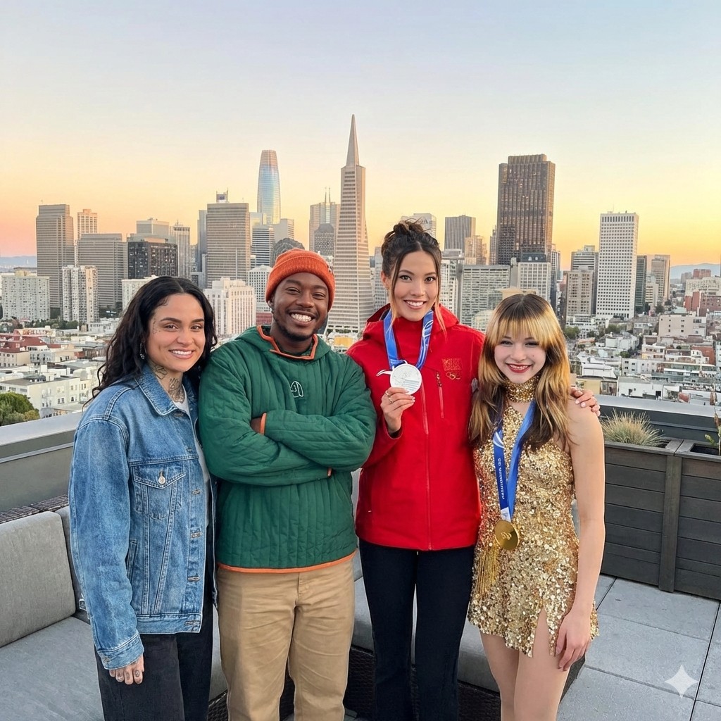 San Francisco skyline as backdrop. Two Olympic medals. One Grammy. All Bay.